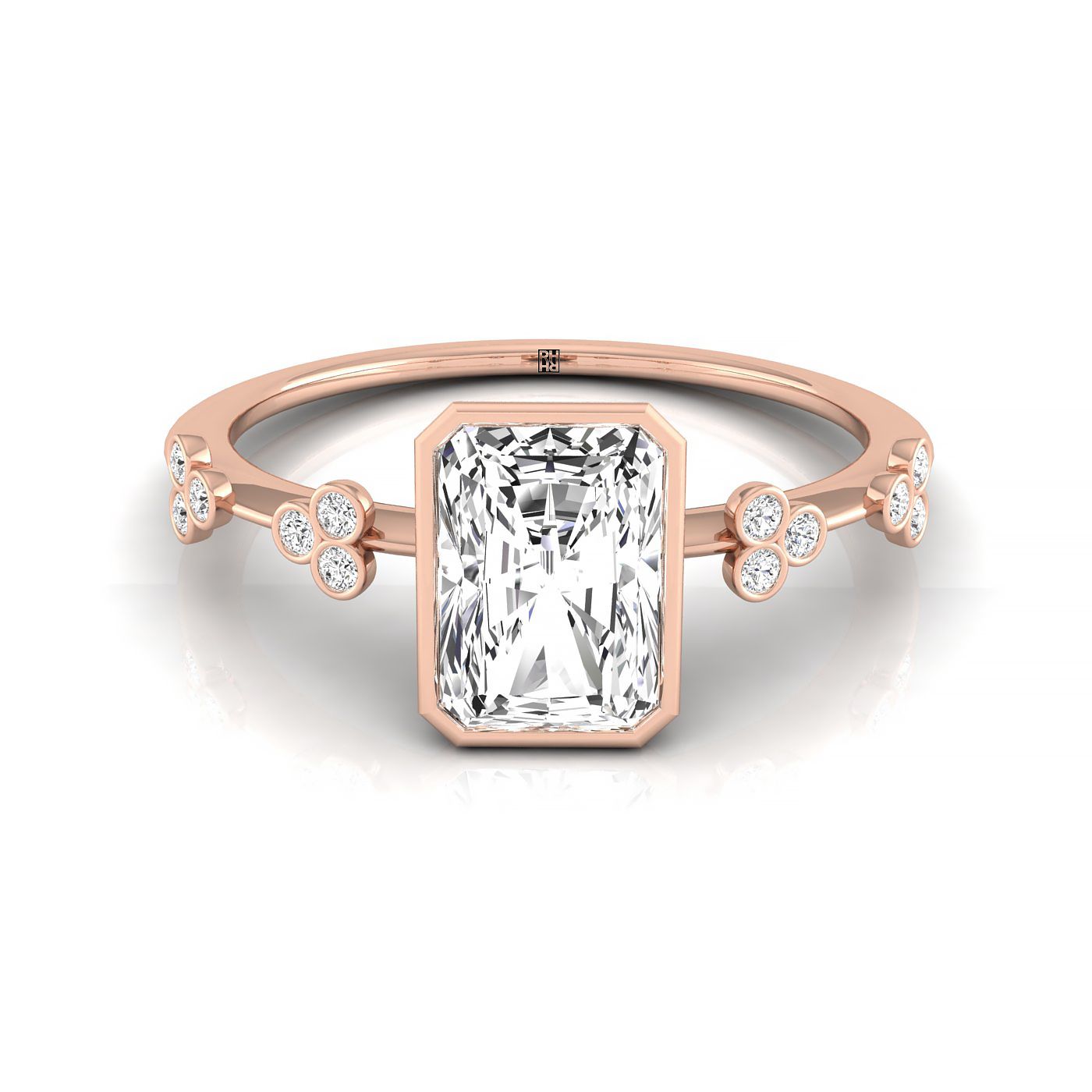 14kr Bezel Set Radiant Engagement Ring With 12 Clover Bezel Set Round Diamonds On Shank