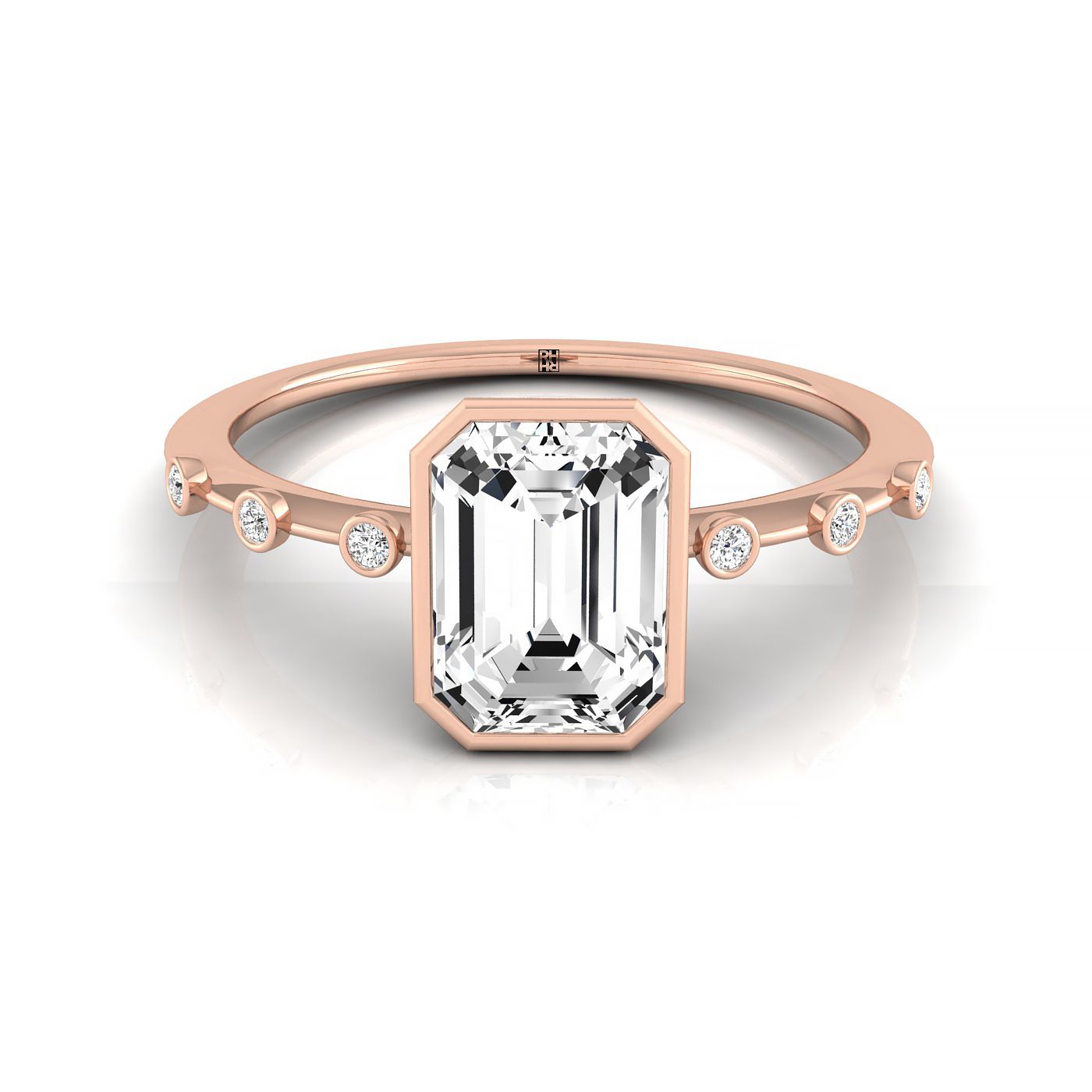 14kr Bezel Set Emerald Engagement Ring With 6 Bezel Set Round Diamonds On Shank