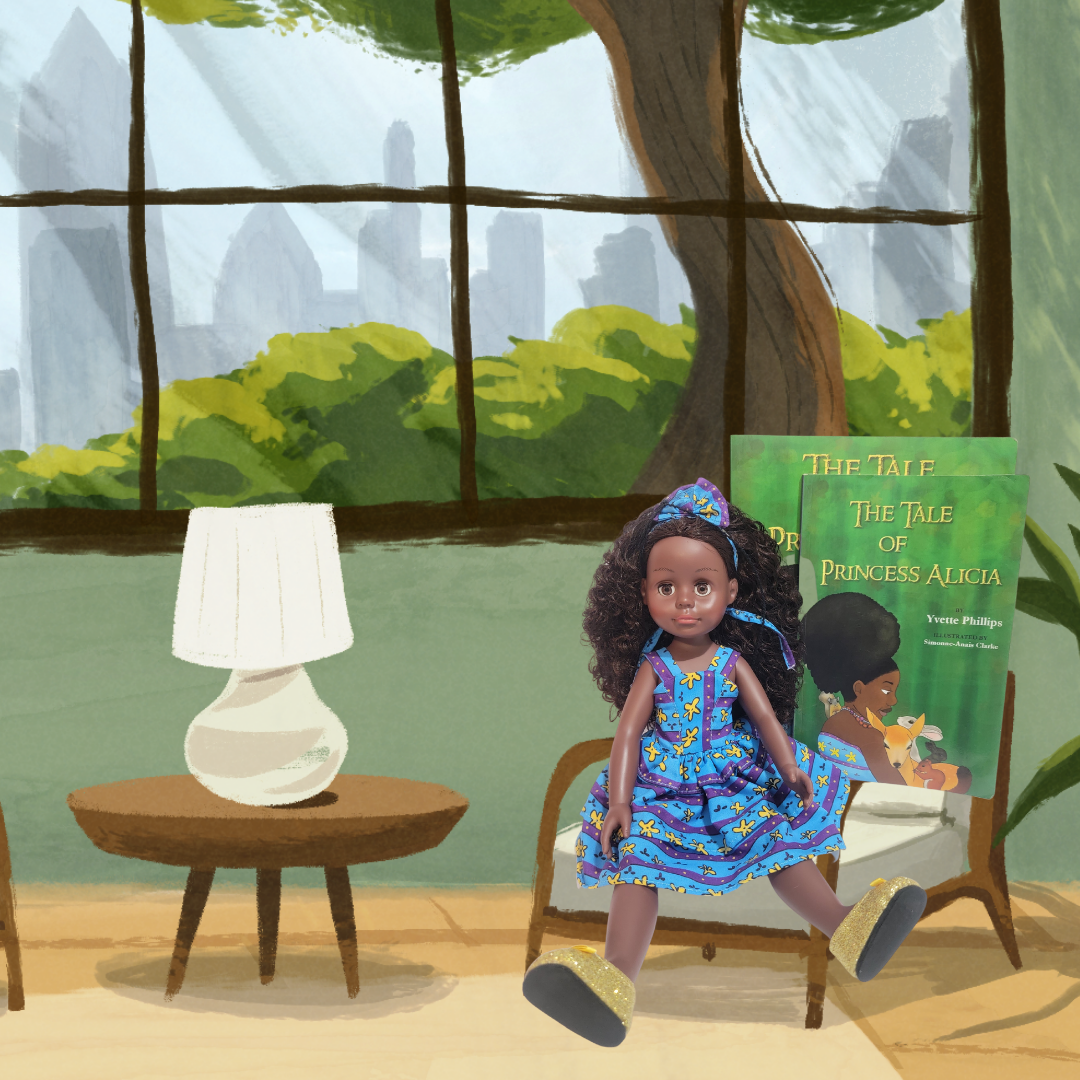 Hello my name is Yvette Phillips, author of this amazing book, "The Tale of Princess Alicia". Meet our beautiful 14-inch brown doll Princess Alicia. She is tall and slender and has light brown eyes with pink eye shadows that closes when she lays down. Her hair is long, thick and curly. Princess Alicia knows how to show real love.